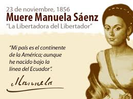 Manuela Sáenz de Thorne (1797-1856), patriota ecuatoriana, conocida popularmente como 'Manuelita', compañera sentimental de Simón Bolívar. Nacida en Quito, contrajo matrimonio con el inglés James de Thorne. Tras la victoria de Pichincha (1822) y la consolidación de la independencia de Ecuador, conoció a Simón Bolívar, se enamoró de él y abandonó a su marido. Acompañó a Bolívar en numerosas campañas y le salvó la vida en el asalto que sufrieron en el palacio de San Carlos en Bogotá (1828). Esta acción le valió el sobrenombre de 'Libertadora del Libertador'. Tras la muerte de Bolívar (1830) fue desterrada a Jamaica y, más tarde, a Perú. En el pequeño puerto peruano de Paita sobrevivió vendiendo dulces y tabaco. Allí murió en 1856 durante una epidemia de difteria.